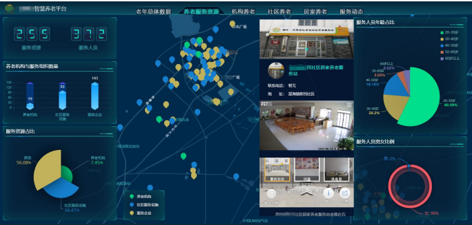 调度指挥中心通过大数据分析和可视化展示,可为政府、企业和个人提供更加精准、高效的养老服务。平台汇聚了各类与养老相关的动态数据资源,如养老机构、养老服务人员、养老服务数据等,通过对数据的深度挖掘与实时分析,可为客户提供科学化决策和精细化管理的支持。此外,该平台还具备实时监测和预警能力,可及时处理设备报警信息,并及时发现养老服务过程中的问题和风险。通过政府统一干预和监管的手段,提高了对养老服务行业的监管效率。如下图所示: