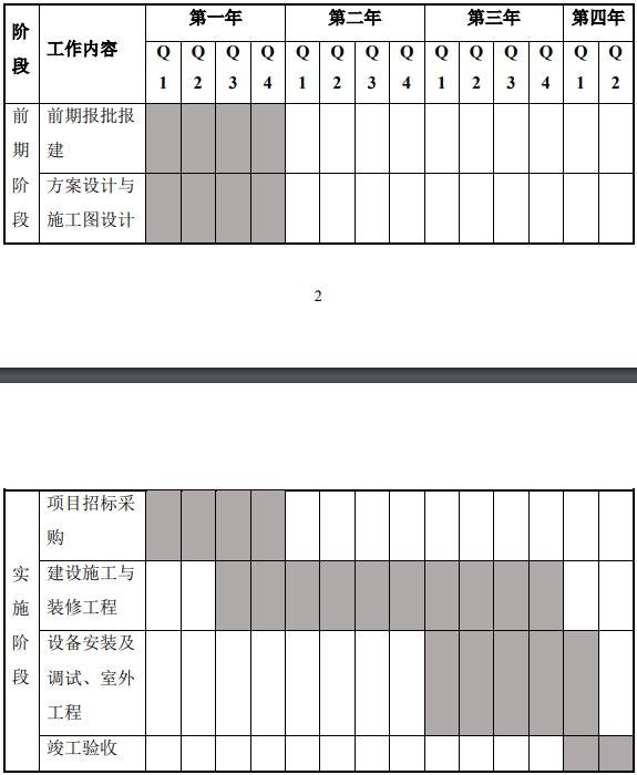 项目建设周期为 4年,包括项目前期调研、选址、谈判、装修、主要设备及软件的询价、采购安装调试等工作,具体的进度安排如下所示: