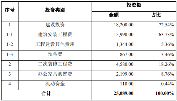 本项目总投资额为 25,089.00万元,其中建设投资 18,200.00万元、二次装修工程费用 4,580.00万元、办公家具购置费用 2,199.00万元、铺底流动资金 110.00万元。 列表如下:单位:万元