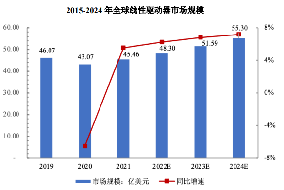 根据调研机构 TECHNAVIO 发布的《GLOBAL ACTUATORMARKET2020-2024》的数据显示,2019 全球线性驱动器市场规模为 46.07 亿美 元,预测到 2024 年将增长至 55.29 亿美元,虽然受到新冠疫情影响,2020 年增 速有所下降,但预计 2019-2024年仍可实现相对稳定的增长速度。