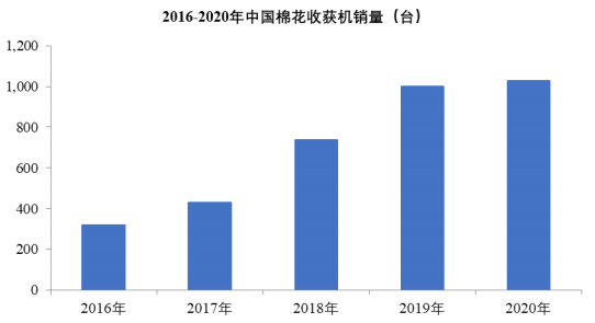 近几年,在我国棉花主产区新疆地区的棉花收获机需求推动下,全国棉花收获机市场呈现快速发展态势。进入 2020 年,受新冠疫情影响,尤其是我国棉花收获机主要销售地区疫情反复,而棉花收获机提机旺季主要集中在第三季度,导致我国棉花收获机市场整体增长速度有所放缓。根据中国农业机械工业协会数据,2020 年我国棉花收获机销量约为 1,029 台,同比 2019 年增长2.90%。