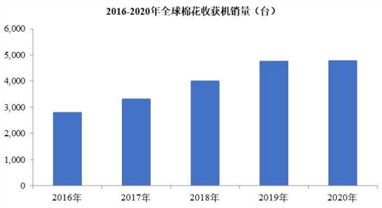 近年来,伴随以中国为代表的发展中国家农业机械化水平、棉花机采水平的不断提升,以及以美国、澳大利亚等发达国家棉花收获机的更新换代,全球范围内棉花收获机市场呈现稳定增长态势。2020 年,受新冠疫情、经济走势影响,全球棉花收获机市场增长有所放缓,销量规模约为 4,780 台,同比 2019 年增长 0.63%。