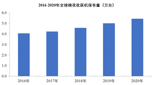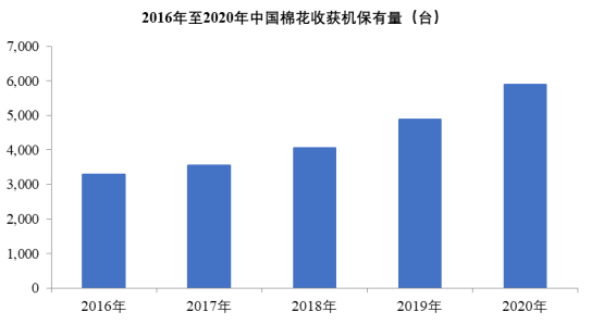 近年来,伴随我国棉花种植全程机械化快速发展,我国棉花机采水平逐步提升,我国棉花收获机的应用也在大幅提升。根据中国农业机械工业协会数据,2020 年我国棉花收获机保有量约为 5,890 台,同比 2019年增长 20.52%。