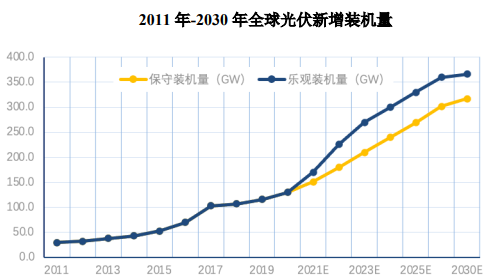 根据中国光伏行业协会预测,在光伏发电成本持续下降和全球绿色复苏等有利因素的推动下,全球光伏新增装机仍将快速增长。在多国“碳中和”目标、清洁能源转型及绿色复苏的推动下,预计“十四五”期间,全球光伏年均新增装机将超过 220GW。