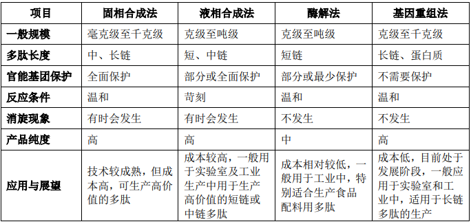 多肽化妆品原料的生产制备方法分为化学合成、生物合成、分离提取三大类。化学合成分为固相合成法和液相合成法,生物合成分为酶解法、酸碱法、微生物发酵法和基因重组法等。目前国内外多肽化妆品原料主要的四大生产制备技术为:固相合成法、液相合成法、酶解法、基因重组法。
