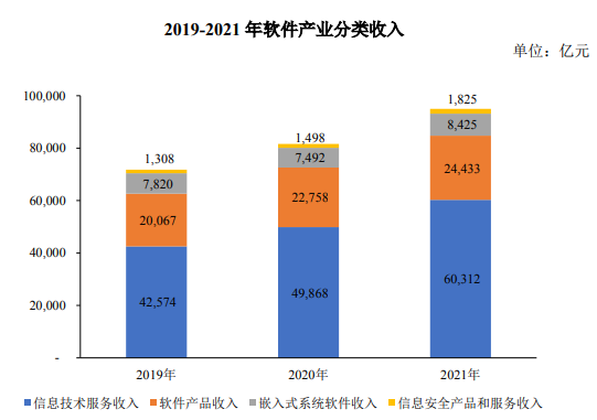2019 年到 2021 年,信息技术服务、 软件产品、嵌入式系统软件、信息安全产品和服务的收入分别从 42,574 亿元、 20,067 亿元、7,820 亿元、1,308 亿元增长到 60,312 亿元、24,433 亿元、8,425 亿元,1,825 亿元,年复合增长率分别达到 19.02%、10.34%、3.80%、18.12%。 伴随信息技术的迅速发展和应用的不断深化,软件和信息技术服务业加快向服务化、体系化和融合化方向演进。服务化方面,软件服务的模式越来越倾向以用户为中心,按照用户需求动态提供计算资源、存储资源、数据资源、软件应用等服务。