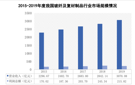 根据中国玻璃纤维工业协会和中国复合材料工业协会联合发布的《行业年度经济运行报告》披露的 2017 年至 2019 年数据,2019 年度中国纤维复合材料行业(包括上游的玻璃纤维行业和下游的复合材料制品行业)规模以上企业实现营业收入同比增长 8.02%,达到 3,070 亿元;全行业利润总额在略有下降的情况下仍超过 200 亿元。