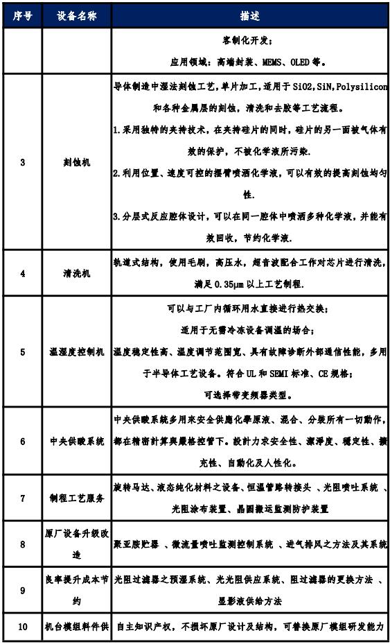 同时在并未公布销售的前提下,仅凭业界口碑与资源以完成近 3000 万元的销售额。公司未来计划专营晶圆制造黄光制程 Coater and Developer(涂布显影设备)系列,包括温湿度控制机、中央供酸系统、光阻 PUMP 等配套设备,及国外高端机型的零部件开发、工艺升级、设备改造服务等。为各半导体生产制造企业制程升级、维护服务,目标在三年内成为国内第一,国际前五的黄光制程制造设备供应商,致力于为“中国芯”制造企业服务。