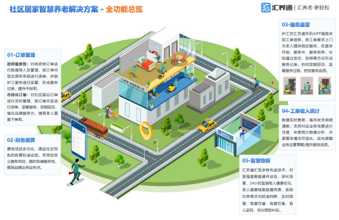 通过深耕线下养老服务,获取居家养老、社区养老、机构养老等各类应用场景,并借助平台规范各项业务流程,发挥信息化、智能化在养老领域的引领作用,建设线上、线下一体化的城市级智慧养老体系。