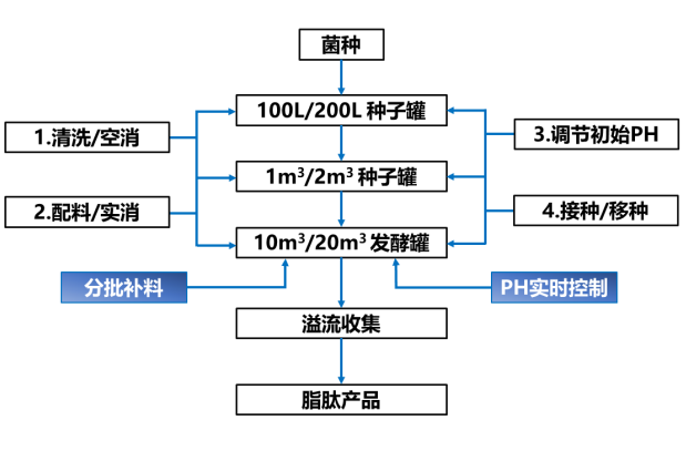 脂肽生物表面活性剂工业化发酵生产采用“泡沫溢流——pH 实时调控——分批补料连续发酵培养”的工业生产工艺,具体如下: