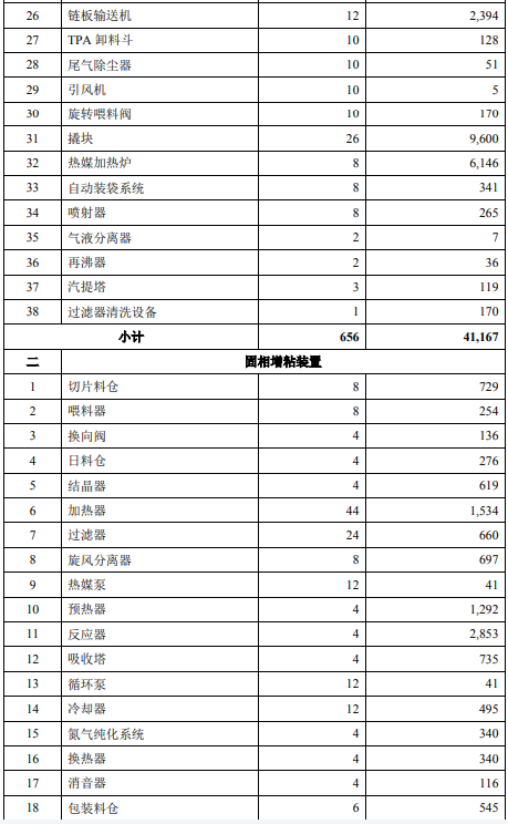本项目的聚酯装置采用英威达-康泰斯公司的连续酯化缩聚工艺技术,固相增粘装置采用布勒公司固相增粘技术。