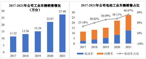 作为中国工业车辆行业领军企业,2017年公司工业车辆销量为11.52万台;至2021年,销量已达到27.48万台,期间年复合增长率达24.28%,高于行业增速。从产品结构上来看,公司电动新能源车量占比由 2017年的23.18%增长至2021年的46.07%,与行业整体趋势一致,提升速度快于行业。
