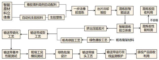 目前公司在输送带生产中,具有完善的生产装备,并建立了成熟的生产工艺。与现有生产相比,项目实施过程中,将在生产过程中的关键环节,应用绿色环保工艺,包括一步法炼胶、输送带成型、输送带硫化、自动化物料仓储运送等。