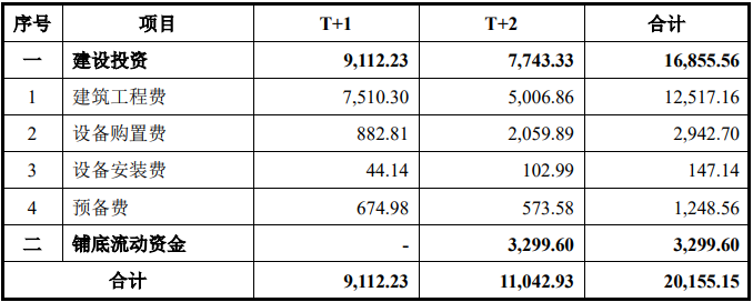 项目计划通过 24 个月时间完成基建和设备购置,第一年计划投入 9,112.23万元,第二年计划投入 11,042.93 万元,具体情况如下:单位:万元
