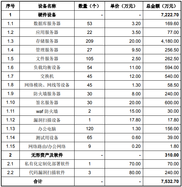 本项目软硬件购置主要用于三年建设期内所投入的设备,建设期内软硬件购置及安装费金额共计 7,532.70 万元,具体构成如下: