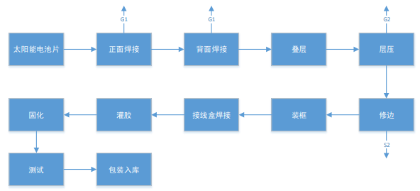 本项目高效太阳能组件生产主要工艺流程包括:正面焊接、背面焊接、叠层、层压、修边、装框、接线盒焊接、灌胶、固化、测试、包装 入库等工序。本项目生产工艺同时兼容生产单双玻/单双面组件,可适用 于不同客户需求做调整。