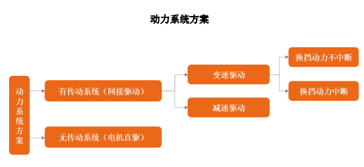 动力系统方案包括无传动系统方案和有传动系统方案,有传动技术方案包括减速驱动和变速驱动方案,其中变速驱动方案包括换挡动力中断和换挡动力不中断两种类型。