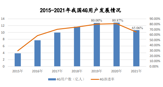 我国拥有全球覆盖最广的移动通信网络,并依托移动通信网络建成了最大的蜂窝物联网,移动网络连接数(包括手机用户和物联网终端)每年保持新增超亿户。截至 2021 年底,全国移动电话用户达 16.43 亿户,普及率为 116.3 部/百人,高于全球平均的 104.3 部/百人。根据工信部数据,截至 2021 年底,我国4G 移动电话用户数约 10.69 亿户,占移动电话用户总数的比例为 65.06%,占比较高。