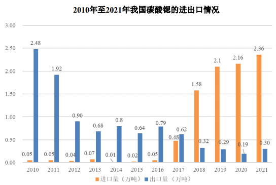 虽然青海等地天青石矿储量较高,但品位较低且难于开采,如最大的青海大风山锶矿品位在35~60%之间,而从伊朗进口的天青石矿品位一般在85%以上。因此,出于经济成本与保护锶资源的考虑,近年来国家对天青石的加工、贸易、开采和主要锶盐碳酸锶初级产品的出口进行限制,我国锶矿产量开始走低,占全球产量的比例从2010年的50%左右降到2021年20%左右的水平。目前,国内天青石矿已无法完全满足国内碳酸锶的需求量,主要从伊朗、西班牙、墨西哥等国进口天青石矿,并且开始加大对碳酸锶产品的进口,自2018年起中国锶的碳酸盐的进口数量明显大于出口数量。