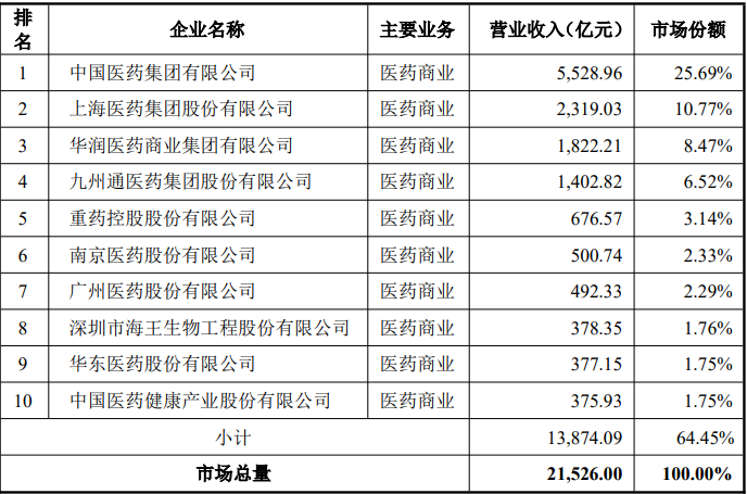 另外还存在大量的业务范围只覆盖几家医院或局限于某一省市县的中小型医药批发公司。在宏观经济下行的影响下,近年来医药流通行业销售增速不断下滑,行业内部竞争日趋激烈。同时,受医改政策持续推进的影响,医药流通行业整合趋势明显,凭借规模化优势和更强的成本控制及运营能力的头部流通药企在竞争中能够取得更大优势。
