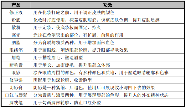 彩妆产品种类繁多,部分常用化妆产品及其功效情况如下: