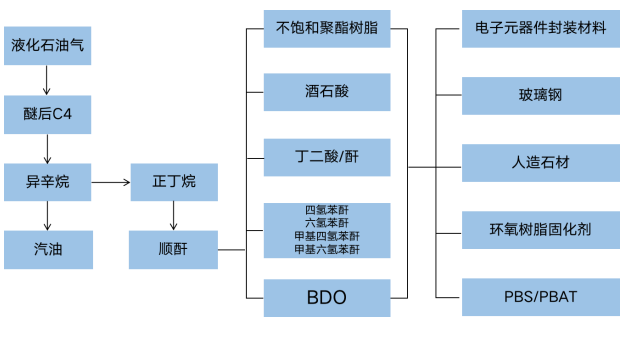 顺酐主要可用于不饱和聚酯树脂、1,4-丁二醇和酒石酸、苹果酸、丁二酸等有机酸产品。