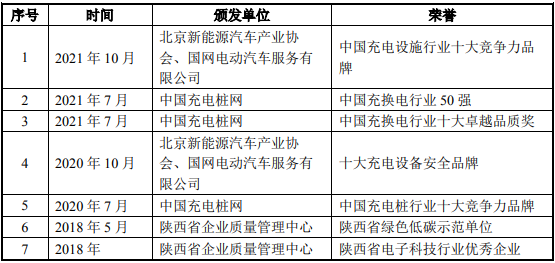 凭借齐全的产品线、周到的售后服务以及技术创新,绿能慧充树立了较好的品牌形象,已获得了高新技术企业、陕西省“专精特新”等资质,入选了《西安市工业和信息化局关于下达2021年市级技术创新项目》、《陕西省科学技术厅关于公示2021年拟认定陕西省瞪羚企业》、《西安市工业和信息化局关于公布2021年质量标杆培育企业》和《西安市工业和信息化局关于公布2021年工业品牌培育企业》等企业名录,并取得了多项企业荣誉,具体情况如下: