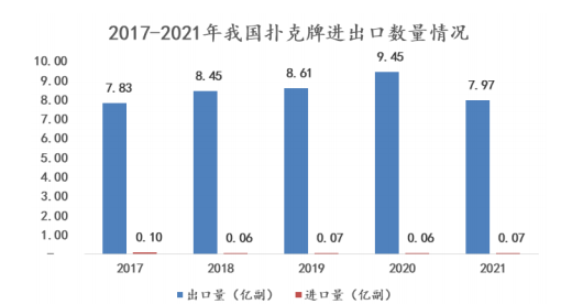 我国作为制造业大国,是全球扑克牌重要的出口国之一,出口数量明显大于进口数量,并且每年出口的扑克牌数量处于持续增长态势。据中国海关数据显示,2017 年至 2021 年,我国扑克净出口数量常年维持在 7 亿副以上。