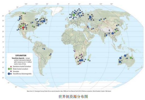 2021 年,全球钒产量(以 V2O5计,下同)21 万吨左右,其中中国大陆产量约 13.64万吨,占全球产量比例约 65%。全球约 88%的钒产量来自于钒钛磁铁矿,约 12%的钒由含钒二次资源(含钒燃油灰渣、废化学催化剂等)及含钒石煤生产。目前,全球钒的生产国家主要有中国、俄罗斯、南非、巴西等。根据美国地质调查局最新的统计资料,全球钒的资源估计为 6,300 万吨(金属钒),其中仅有 1,300 多万吨是可开采储量,有3,800 多万吨为未来可开采的保有储量。