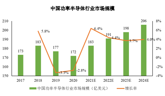 目前国内功率半导体产业链正在日趋完善,技术也正在取得突破。同时根据Omdia 统计,中国也是全球最大的功率半导体消费国,2019 年市场规模达到 177亿美元,占全球市场比例高达 38%。预计未来中国功率半导体将继续保持平稳增长,2024 年市场规模有望达到 206 亿美元。